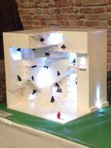 Si entrava in questa sala bellissima, lunga, stretta e bassa, fatta di mattoni, dove avevano allestito due tavoli con varie costruzioni particolari.
