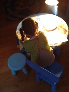 Oggi pomeriggio ha tirato fuori gli acquarelli e mi ha chiesto se poteva “isolarsi”, con le finestre chiuse e la luce della lampada puntata sul foglio.