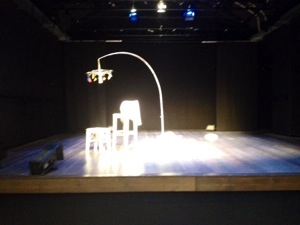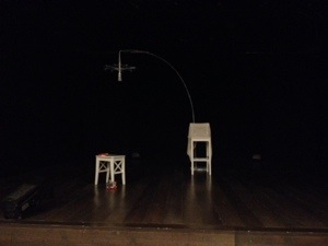 Il palco completato da pochi oggetti bianchi: uno sgabello, un panchetto e una specie di lampadario.