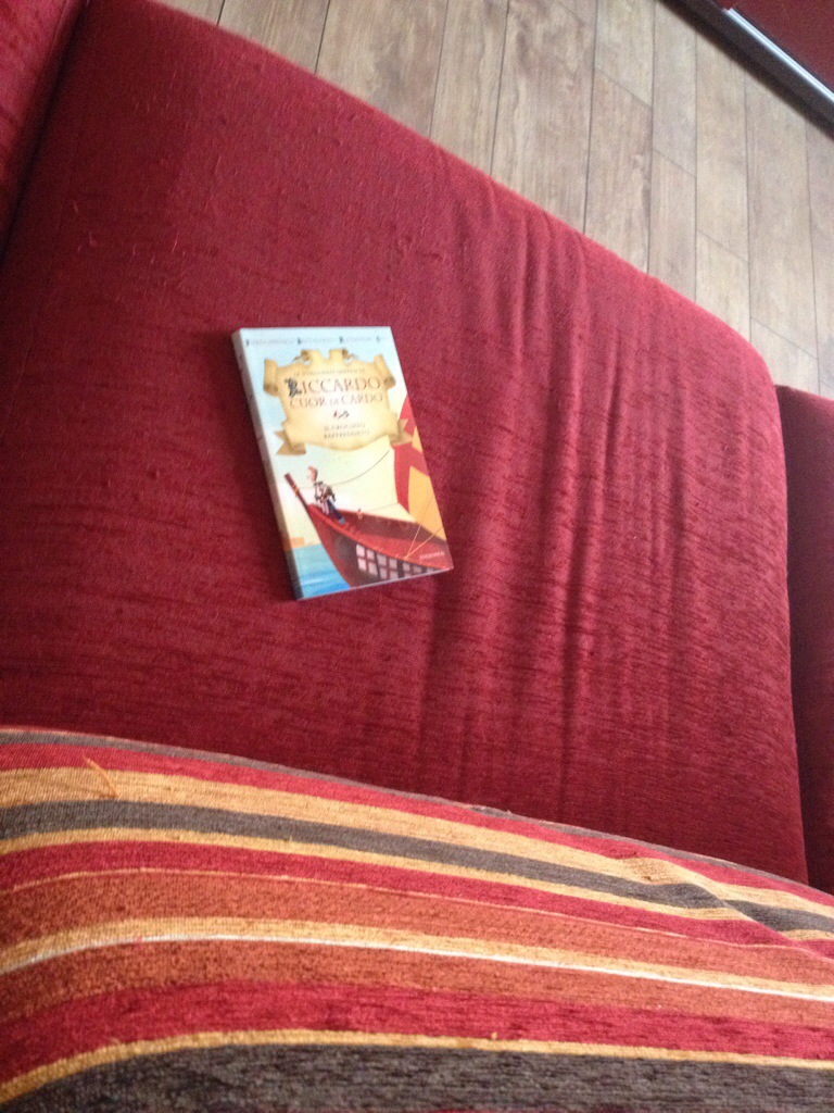 Zucchetta gira per casa con il cartone dei libri pieno per tutta la cada. Stamattina ho trovato Zucchetto in pigiama sul divano, immerso nella sua prima lettura in solitaria. Mi ha già chiesto altri titoli.