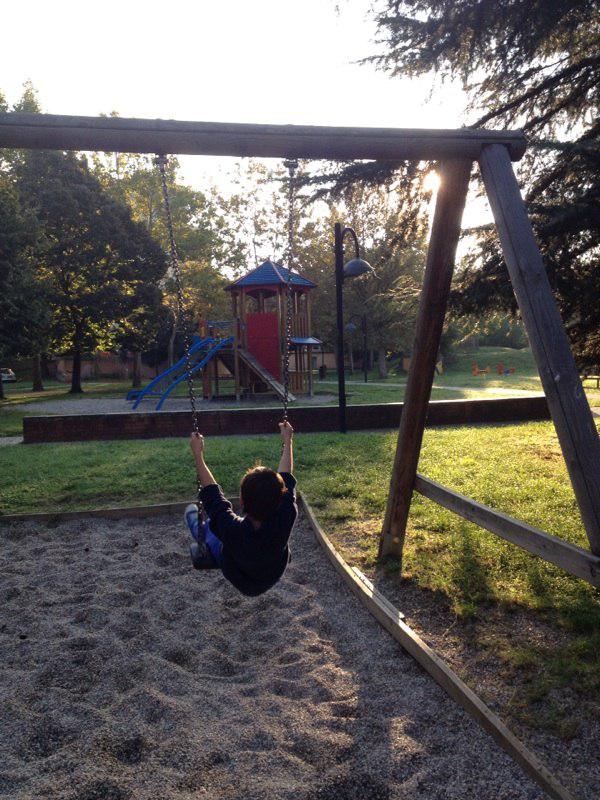 Arrivati a destinazione, dopo aver ascoltato tutte le sue lamentele, gli ho proposto di fare una scappata al parco. Prima abbiamo fatto una gara di corsa (ma tanto lui vince sempre) poi è saltato sull’altalena dove ha ritrovato il buon umore.