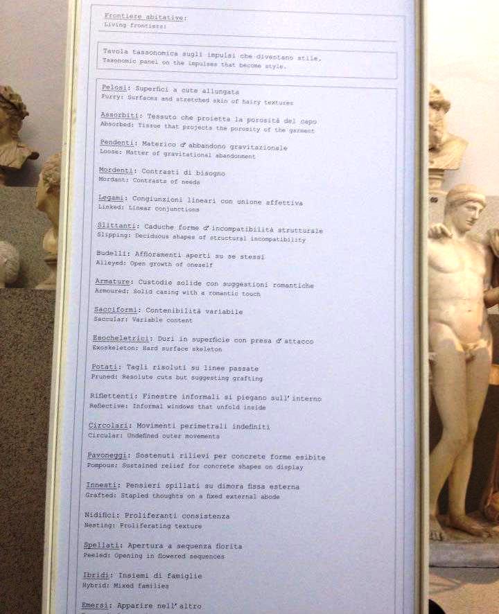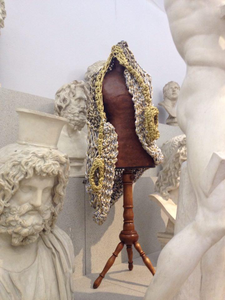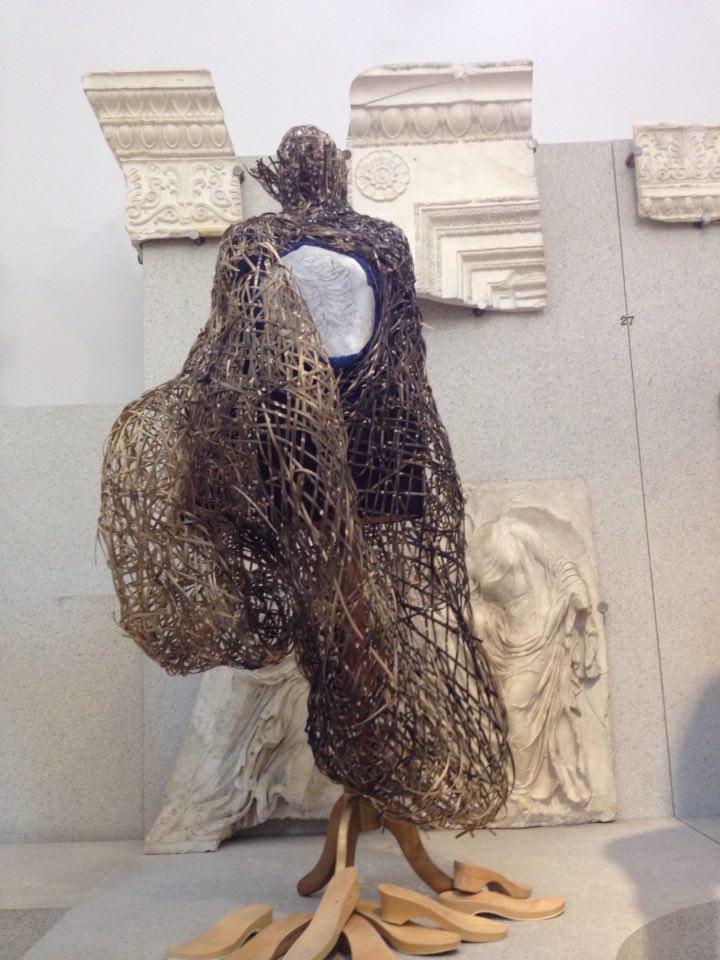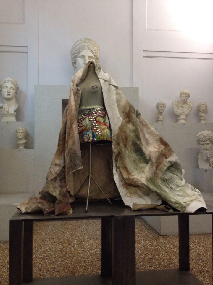 “… l’artista rende visibili i princìpi della riflessione organica sul corpo e sulla trasformazione dei suoi impulsi emotivi in stile. Nel percorso espositivo della preziosa collezione di calchi in gesso di sculture greche e romane Sissi colloca manichini rivestiti da abiti e accessori provenienti da “Addosso 1995/in progress”, l’archivio del guardaroba-creatura che raccoglie gli abiti e gli accessori realizzati dalla stessa artista con tecniche artigianali e successivamente da lei indossati, catalogati e dotati di nomi propri e specifici segni di riconoscimento.”
