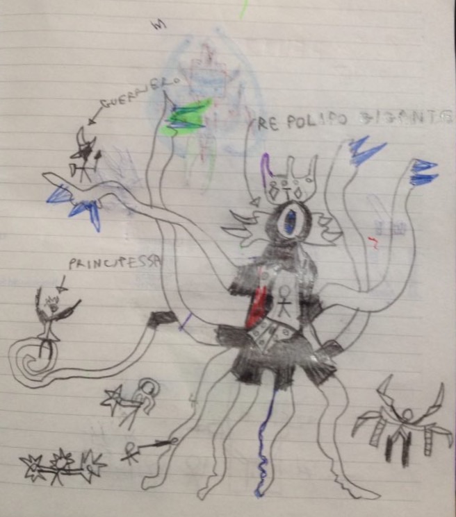 Poi scende e mi mostra i suoi ultimi disegni fatti di mostri, a biro.