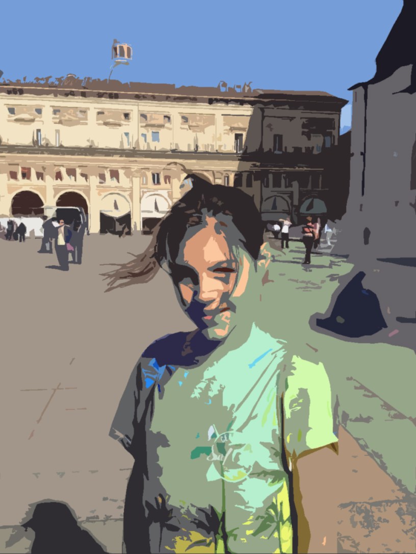 Siamo uscite e nella nostra bella piazza Maggiore ventosa, le ho scattato la prima foto da “piccola donna”.