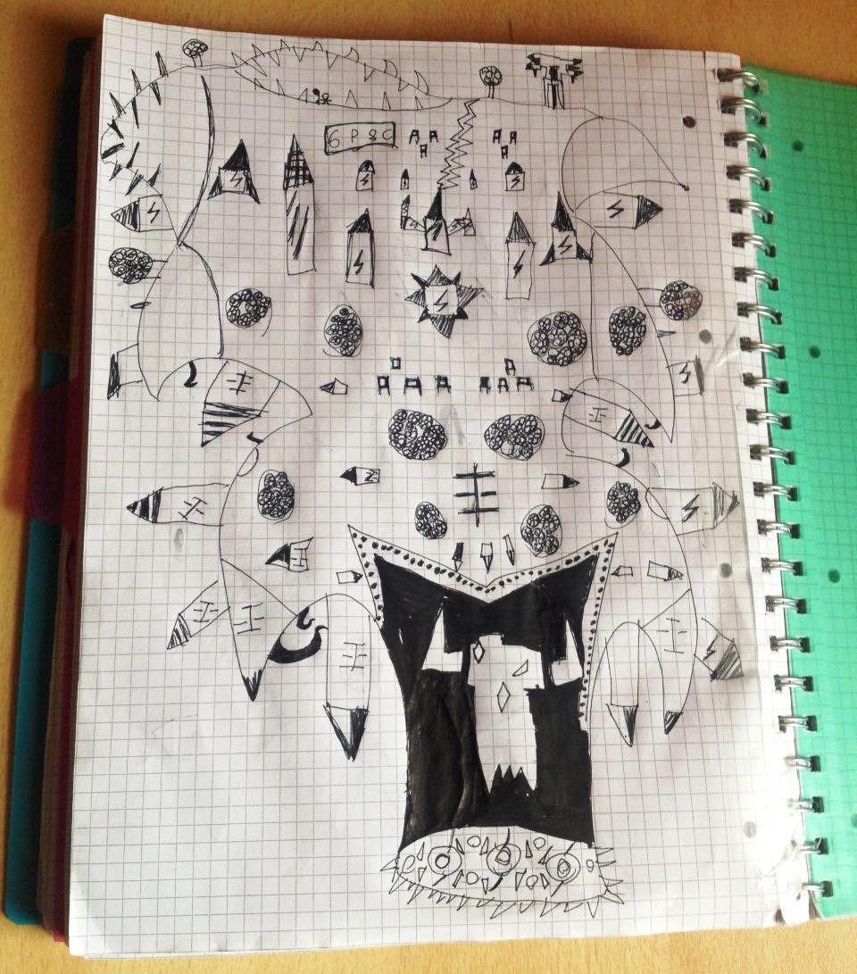 Sempre su fogli grandi, tipo A4, ed i suoi disegni sono ancora appiccicati per la casa, su ogni muro, porta ed armadio.