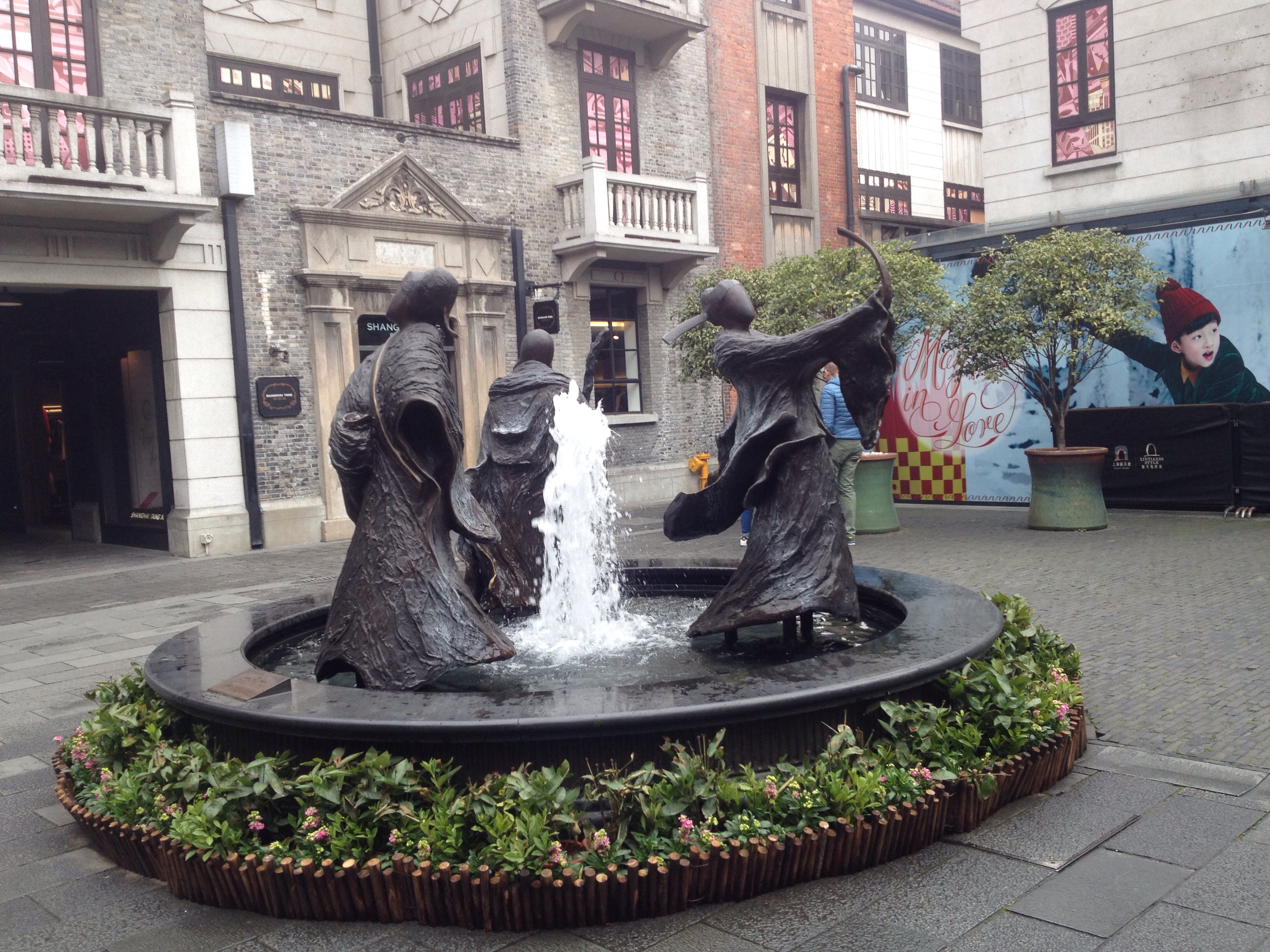 Poi la prima tappa è stata a Xintiandi, un piccolo borgo elegante con lo stile architettonico occidentale! Nella piazzetta, una fontana con tre statue raffiguranti: la fortuna, la longevità e la prosperità.