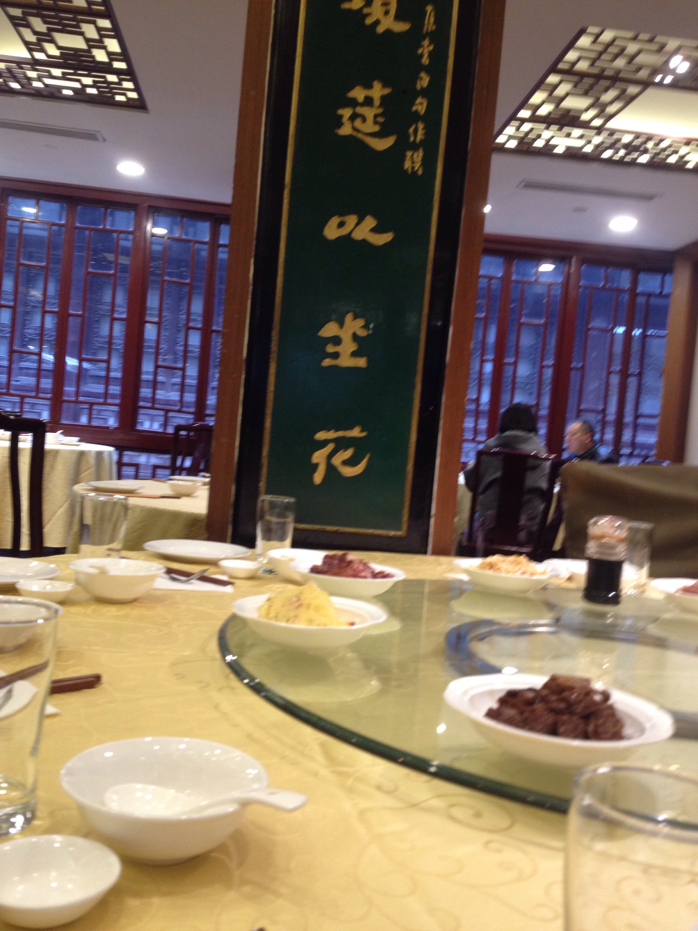 Al primo piano, abbiamo mangiato seduti in grandi tavoli tondi con le portate al centro, sul pianale roteante. E le portate erano numerose e continue, in un turbinio di assaggi. Ma i cibi conosciuti avevano, chiaramente, dei sapori diversi e la scoperta era continua.