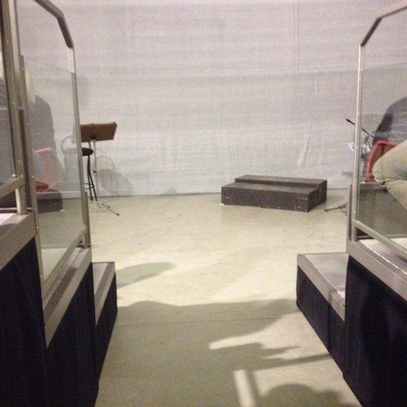 Come sfondo un’enorme telone e sul soffitto una quantità esagerata di fari e faretti ed impalcature.