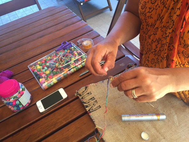 Invece, grazie a questa mancanza mi è venuta l’idea di sostituire il filo di juta con della lana. Mia mamma ha gomitoli di ogni gradazione di colore e così è iniziato un nuovo gioco. E grazie ai fili colorati e alle perline in legno rimaste, oggi ho fabbricato: “Nuo”, una borsetta colorata da frange e cuciture.La bretella all’uncinetto mi ha costretta a rispolverare gesti di milioni di anni fa.