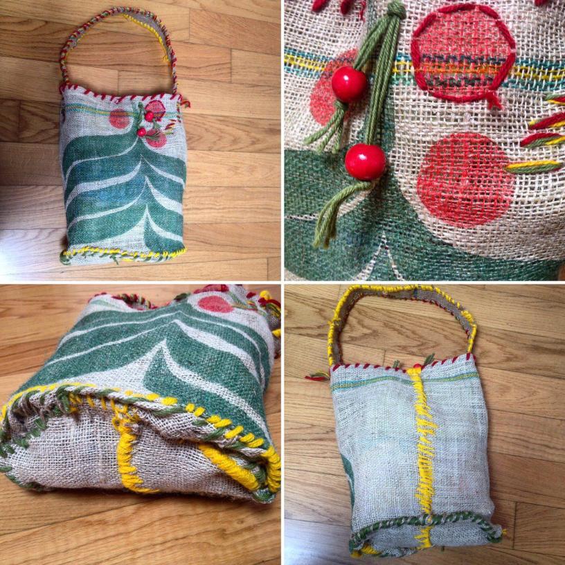 Questo è un modello a secchiello, modello: “Ciliegie di caffè” dalle cuciture verdi, gialle e rosse e col manico in juta.