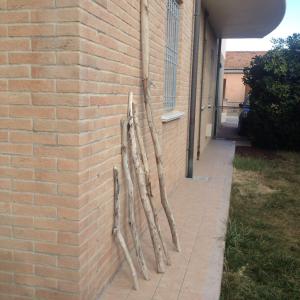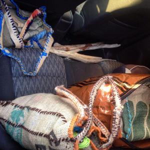 Poi mi sono posta il problema di come esporre le mie borse. Così, l’altro giorno ho raccolto dei bastoni lungo la spiaggia, vicino al fiume immaginandomi il mio espositore naturale.