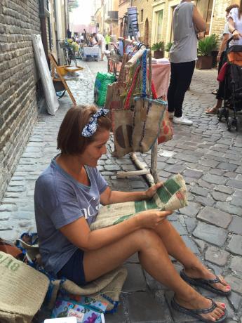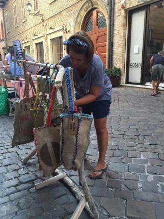 Quindi ho deciso di informarmi per poter vendere le mie borse di juta al mercato di Fano, dove risiedo per le vacanze estive. Dopo vari tentativi sono riuscita a parlare al telefono con una signora per avere istruzioni. Mi ha spiegato la procedura per poter diventare un’ambulante delle “opere dell’ingegno”. Il primo giro l’ho fatto in Via Vitruvio dove ho compilato un’autocertificazione in cui riferivo i miei dati e spiegavo cosa avrei venduto, dopodiché ho versato 10€ alla tesoreria della Banca in Piazza XX Settembre, infine ho consegnato i documenti in Via San Francesco presso il Comune all’ufficio protocollo. Carte.