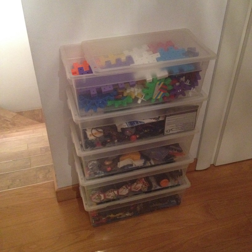 Ci sono cinque scatole di giochi sul pianerottolo che oggi mio figlio ha deciso di portare in garage.