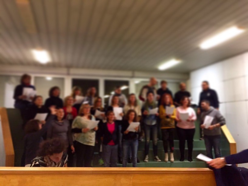Ieri sera sono rimasta direttamente nella scuola visto che i bimbi avevano avuto lezione fino alle 19.30. A piccoli gruppi sono arrivati ” i Vecchioni” cioè, i coristi del Piccolo Coro di qualche secolo fa. L’atmosfera era già familiare o forse sono io che la sento così quando li incontro. A grappoli siamo entrati nella scuola e questa volta avevamo i testi stampati per tutti. Ogni faccia, un pezzo di vita trascorso insieme: su qualche praticabile a cantare, su qualche pullman a viaggiare, in qualche avventura condivisa, chi per qualche anno, chi per tutta la sua infanzia. Mia sorella non doveva venire ma alla fine anche lei non ha resistito a perdersi una tale parentesi di pura gioia. Così tutti pronti, siamo saliti sul praticabile nell’aula della scuola, legati con grossi nodi dalle note di quelle canzoni ripetute chissà quante volte in passato e partecipi al nostro viaggio nel tempo.È difficile riuscire a spiegare con le parole quale sia il linguaggio della musica, di un coro, di una forte energia che si sprigiona e avvolge di benessere. Proprio così, mi sentivo avvolta di benessere mentre potevo tornare in quella me spensierata, leggera e urlante di musica.