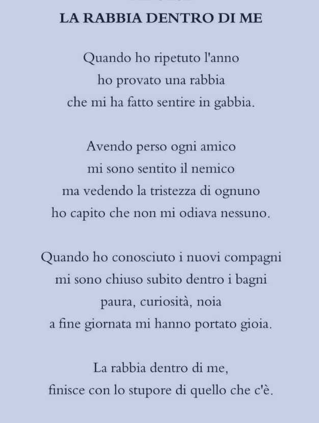 Entrare nella biblioteca del paese con una poesia da leggere non é da tutti. Se poi nella poesia si parla di sé, ancora più difficile. Combtere con quelle parole, la vergogna di una bocciatura, é addirittura eroico.