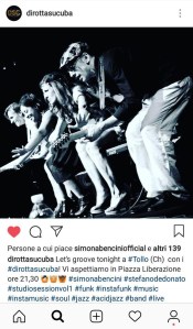 Sono in spiaggia seduta sulla sabbia mentre curioso Instagram e scorgo una foto dei Dirotta su Cuba in bianco e nero. Sotto, le info sul loro concerto a Tollo. Cerco su Google maps e scopro che é solo a un’ora di distanza! Convinco mio marito (che in realtá accetta immediatamente) e subito dopo mi balena l’idea che potrei fare un’intervista a Simona Bencini, che un paio di anni fa ha allietato il mio compleanno al Bravo Caffé a Bologna. Così le scrivo un messaggio da instagram chiedendole un’intervista per www.testimonianzemusicali.com e lei mi risponde: “certo”! È fatta! Ma voglio essere sicura cosí scrivo ad una conoscenza comune che rafforza la mia richiesta. Mi conferma l’intenzione di Simona che riferisce di andare molto prima, quando fanno la prova del suono. Perfetto. Al pomeriggio partiamo in direzione Tollo (viva il navigatore!)