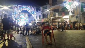 Ci sediamo nelle panche di una pizzeria e ceniamo mentre ascoltiamo le prove. Verso la fine si siedono vicine tre signore anziane che pasteggiano con trippa e birra. Una delle tre dice : “i forestieri sono meglio dei paesani” e si lancia nei racconti familiari dove “tutti i parenti vengono a mangiare a pranzo a casa mia che ho l’aria condizionata solo in sala e che questa cantante, sentiamola, canta solo da due anni…” E io ribatto: “Ma nooo signora altroché due anni, sentirà che bravura!” E non sto ad aggiungere che è la Regina del funky italiano e che ci fa in una piccola piazza così? e che sì la qualità non fa rima con quantità…
