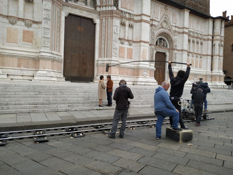 Sabato mattina. Passo da Piazza Maggiore prima di entrare al lavoro. Sui gradini davanti alla chiesa vedo l’attrice, dal vivo, per la prima volta. Riesco a malapena a scattare una foto poi mi blocco, ferma a guardare, sotto al cielo grande. Senza misura scendono lacrime mentre cerco di salvare il trucco, scendono senza misura. Sta interpretando una scena che credo di avere decifrato e sento di far parte di qualcosa che è più grande di me.