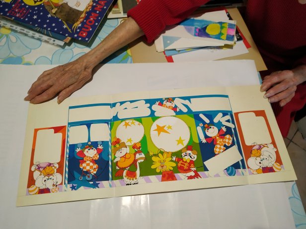 Quindi le ho consegnato il materiale stampato finora, occupando tutto il tavolo con la locandina 70×100 e quasi con vergogna, un album con una ventina di foto stampate in un bel formato che la ritraevano in vari momenti della sua carriera all”Antoniano. Lei con un disegno sottobraccio, lei seduta in una delle sue scenografie, lei accanto a una bambina, lei con quello sguardo fiero che le ho restituito insieme alla vivezza di quei momenti. Perché molte volte le persone hanno bisogno di rivedere che cos’hanno realizzato, chi erano e che cosa rappresentavano…ed ero talmente presa dal suo coinvolgimento che non ho realizzato nessuna intervista nè nessuna delle foto che poi mi sono venute in mente al ritorno! E dalla carpettina di cartone usciva tutto il suo mondo fatto di disegni, depliant, biglietti natalizi e i suoi primi capolavori di quando lavorava ancora per Paul Campani.