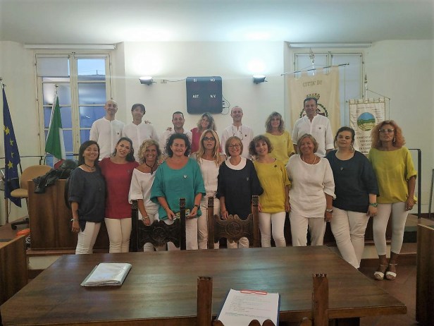 Subito dopo arriva Luciana, la direttrice, stravolta e stralunata perché stasera si perde una grande festa organizzata tra parenti e amici. Mi sento in colpa, io che per ogni momento libero organizzerei solo concerti…anche lei apprezza il posto e pian piano arrivano gli altri coristi, alcuni già in divisa, altri in incognito… Antonella passa le basi al tecnico mentre ci accordiamo per i microfoni ( 2 fissi per il coro, uno per i solisti e uno per il presentatore). Inizia lo sparpagliamento tra borse sulle sedie, amici da salutare, fughe fugaci al bar e coristi in arrivo. Anche stavolta per fortuna c’è Alfredo, nominato come “addetto dell’ufficio stampa” che ha già iniziato a documentare! Stasera c’è anche una nuova corista che resta stupita della nostra adrenalina, perché forse non ha ancora capito che è uno degli ingredienti basilari per una buona riuscita! Poi arriva Giacomo, da uno dei suoi viaggi di lavoro, che ormai ho soprannominato “vice”, indispensabile colonna (vice presidente della nostra associazione, presentatore, mediatore, videomaker dei momenti topici…) Dopodiché saliamo nella sala comunale dove appoggiamo le nostre cose ma siamo rumorosi, ridacchianti e sembriamo più i bambini del Piccolo Coro che i Vecchioni di Mariele…poi finalmente, raggiungiamo il palco per iniziare le prove ma alcuni leggono le parole, altri parlottano e Luciana non c’è, perché continuamente sbaglia attacchi, suggerimenti, parti, mentre io la guardo smarrita. Una prova disastro, oltretutto senza alcuni solisti sostituiti alla spicciolata, altri che ritardano alcuni che decidono di non provare nemmeno e i suoni dalle casse che sono ingombranti,impastati con le nostre voci, mentre il fonico cerca di istruirci (ma non dovrebbe essere il contrario?!) Ma alle 19.30 dobbiamo smettere e i brani provati non sono nemmeno la metà…torniamo nella sala comunale per lasciare le nostre cose e ci sediamo appena fuori dalla corte, ai tavoli vicini di uno stand, per cenare con acqua e spianata, offerte gentilmente dall’organizzazione. Impugno il buono da 20 spianate e quando raggiungo lo stand, il ragazzo alla cassa alla parola “venti” sbianca ma la signora a fianco prende subito in mano la situazione. Così scrivo su un foglio le ordinazioni anch’esse confusionarie… perché “la delicata” è pur sempre la cotto e stracchino…io, Angela e Giulia ce le facciamo insacchettare perché preferiamo mangiare dopo il concerto (siamo le più giovani ma anche le più saggie…!?) Paolo è distrutto dai due lavori massacranti che sta facendo da tempo ma comunque c’è e la sua presenza costante lo rende unico. Occupiamo tre tavolate di Vecchioni e spianate ma il tempo stringe e inizio a sentirne la morsa, così ribadisco nella nostra chat l’ennesimo avviso dell’orario di ritrovo.
