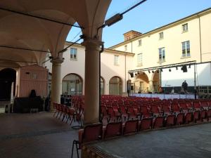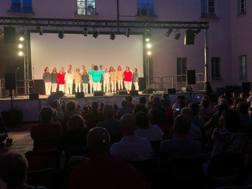 Prove alle 18.30 presso la corte comunale di San Lazzaro, precedute da chat su chat del nostro coro variegato dei Vecchioni di Mariele. Prima la conta, poi la mappa, poi la preoccupazione del parcheggio, la scaletta delle canzoni che stia dentro un’ora esatta di tempo, poi battute, foto superflue, domande ripetute…un insieme di caos e ordine sgomitanti. Sono la prima ad arrivare ma solo di pochi minuti perché incontro quasi subito Arcibaldo (il suo nome d’arte!) che con la camicina bianca comprata per l’occasione sta proprio bene (finché non se la apre e rovina tutto…). Raggiungiamo la corte che altro non è che il cinema all’aperto trasformato in palcoscenico. Carino!