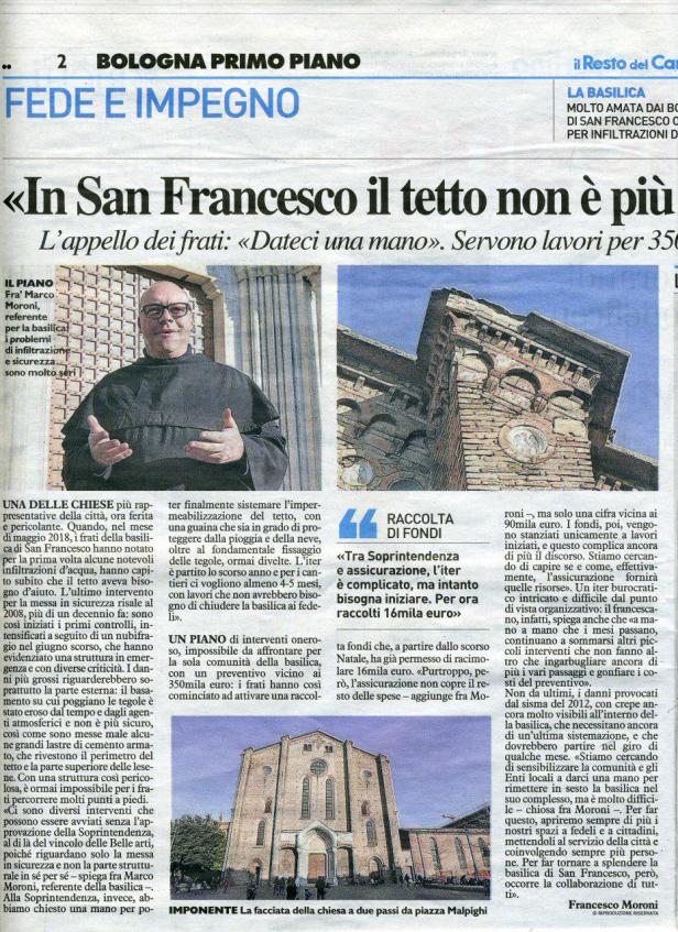 Al bar leggo un articolo sul Resto del Carlino dove Fra Marco Moroni chiede aiuto per ristrutturare la chiesa di San Francesco in Piazza Malpighi a Bologna.