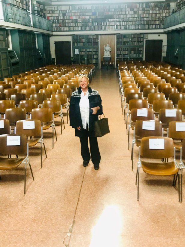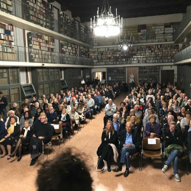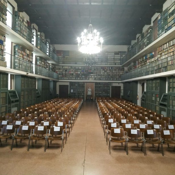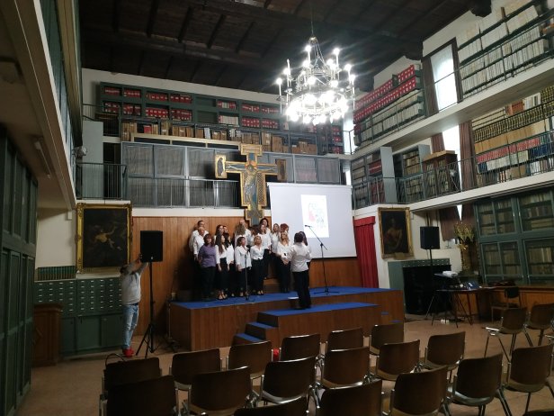 Per prima arriva Angelina (per me è un buon segno…) poi non ricordo più l’ordine mentre continuamente vigilo il portone, infatti l’ingresso al Radio-Concerto è predisposto da un altra entrata con relativi boccioni per l’offerta libera. Luciana arriva arzilla e tutti i coristi piacevolmente meravigliati dalla bellezza del salone della biblioteca. Iniziamo le prove ma sul palco non ci stiamo e ci disponiamo sfalsati.