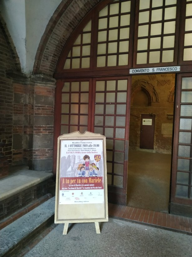 Alle 16.30 lascio il tavolino del bar assolato e mi raggiunge mio marito nel tragitto alla Basilica di San Francesco in Piazza Malpighi. All’ingresso della cancellata ci accoglie la locandina che abbiamo realizzato io e Claudio per l’evento intitolato, il Radio – Concerto “A tu per tu con Mariele”. Nel manifesto capeggia un meraviglioso disegno storico di Carla Cortesi (e non di Luisa Rossi!) che realizzò nei primi anni settanta, dove Mariele è attorniata da un gruppetto di bambini (alcuni sono proprio tra i coristi dei Vecchioni di Mariele!). Sullo sfondo, la Basilica e sotto, tutti in fila, i patrocini: del Comune di Bologna, dell’Antoniano, della Fondazione Mariele Ventre, di Servizi Museali Bologna (unico sponsor grazie alla fatina Francesca Isceri) di PUNTO RADIO (che ha promosso l’evento) e della FAI. Per ogni patrocinio ho speso molto tempo tra mail, telefonate e controlli incrociati. Sono riuscita a divulgare l’evento grazie a ben due puntate su PUNTO RADIO (inventando un jinge)