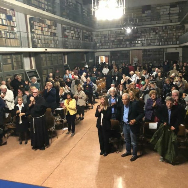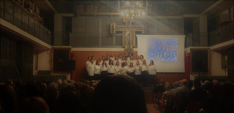 Parte il primo audio e la voce di Mariele riempie il salone creando commozione per chi l’ha conosciuta e curiosità agli estranei. Con la coda dell’occhio controllo i posti e manca solo un’ospite che arriva poco dopo, il Vice Sindaco Marilena Pillati. Fra Marco ci riprende col cellulare in prima fila e il salone è pieno come la mia soddisfazione. Scorgo volti familiari, amici, persone importanti per la nostra storia corale come Liliana Caroli, Mario Cobellini e alcuni genitori ma adesso posso cantare tranquilla e chiudere le finestrelle organizzative…Claudio fa una regia perfetta ascoltando attentamente il pubblico negli applausi.