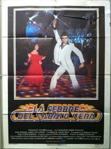 metri di muri con i cartelloni pubblicitari e chissà quanti adesivi appiccicati nelle camerette, sulle automobili e chissà dove. Giro sola nella penombra, leggo a fatica le diciture e m’illumino dalle luci della disco music quando incrocio il poster della febbre del sabato sera. John col suo collo a punta e la faccia da schiaffi mi guarda e sembra dirmi: “Eccomi, ci sono anch’io” ricordandomi quanto sia stato presente in casa mia in quegli anni.
