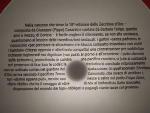 Finalmente trovo la canzone che cercavo proprio nella sezione “MUSICA RIBELLE” che fotografo e filmo. Trovare un brano dello Zecchino d’Oro all’interno di una mostra, mi rende contenta perché spiega il senso di un testo che va al di là della canzoncina orecchiabile. Racconta la formula che ha inventato lo Zecchino d’Oro di comunicare concetti intelligenti ai bambini con le parole adatte.
