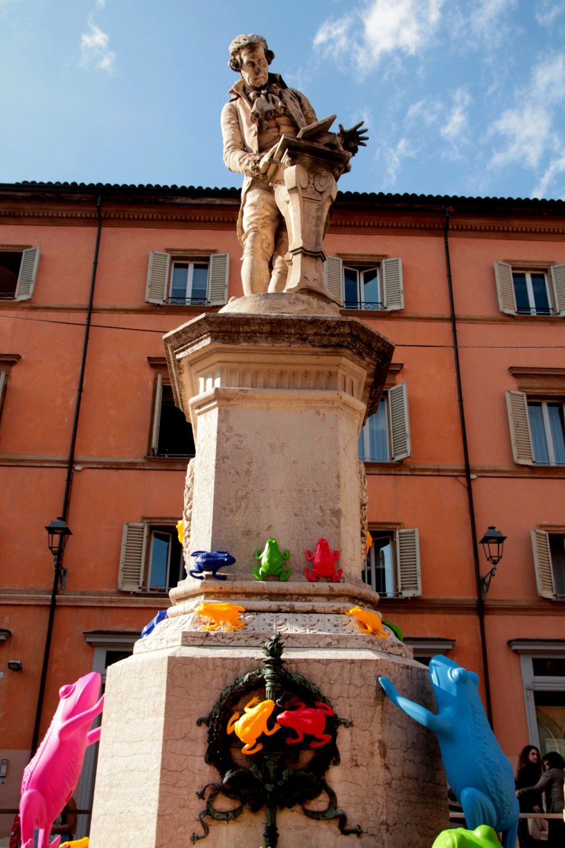 Così come l’arte genera arte, succede anche con la curiosità; questa volta, la mia, é stata pungolata da tre rane di plastica, appoggiate sullo scaffale di un negozio. Leggendo il marchio impresso nella pancia del ranocchio, ho trovato il marchio CRACKING ART GROUP e scoperto che trattasi di un collettivo di sei artisti che opera dal 1993 attraverso arte rigenerante e installazioni artistiche nelle città italiane ed europee per sostenere cause sociali e ambientali. Il movimento prende il nome dal verbo “to crack” (spezzarsi, rompersi, crollare) e dalla reazione chimica che trasforma il petrolio in plastica, mettendo in evidenza il rapporto sempre più stretto tra vita naturale e realtà artificiale. Le rane scoperte sullo scaffale del negozio, sono tre delle cinquecento, donate da CRACKING GROUP ai benefattori che hanno partecipato alla prima raccolta fondi online di Bologna, intitolata “Un passo per San Luca” promossa nel 2013 per ristrutturare i portici che vanno al santuario.