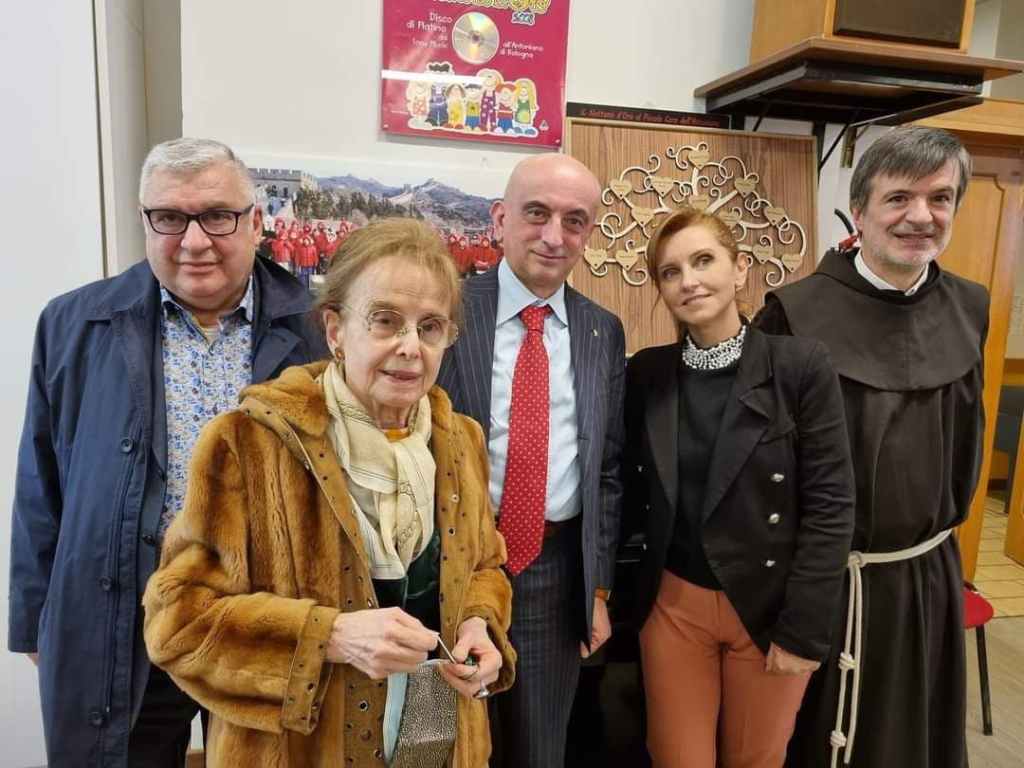 Poco dopo é arrivata Maria Antonietta facendo gli onori di casa mentre la parete bianca del suo studio aspettava di essere riempita, perfetta per le misure del dipinto, pronta col chiodo già piantato. Dopodiché abbiamo raggiunto l’Antoniano per la consegna ufficiale dell’omaggio a Mariele e percorrendo via Guinizelli ho conosciuto altri due amici del signor Marchione: il Dott. Garavelli (IL DOTTOR CIRCO) e il suo fedele assistente, Geom. Maimone, due personaggi incredibili che sono stati il punto d’incontro tra Giuseppe e Daniele Perini. Ed é stato singolare scoprire quali intenti e incontri ci siano stati dietro all’omaggio a Mariele. Raggiunta la scuola del Piccolo Coro all’Antoniano, ho sentito forte la commozione dei presenti nel varcare la soglia di un loro mondo immaginato dove la storia, ancora una volta, ne é stata la protagonista. Nella scuola Giuseppe ha scartato il quadro e per l’occasione erano presenti: la signorina Ventre, Fra Cavalli, il M° Simoni con due bimbi in divisa del Piccolo Coro “Mariele Ventre”, il signor Perini, il signor Antonini, il signor Dardari (anche lui con una storia familiare pazzesca scoperta su Gilberto Dardari, la storia della TV) il Dottor Garavelli, il Geom. Maimone, infine io e Carla come rappresentanti dei Vecchioni di Mariele. Sergio Marzocchi ci ha fatto sistemare per la foto di rito (mentre Cavalli ironizzava sulla mia presenza) e subito dopo la Ventre ha ringraziato l’artista, esprimendo con commozione ciò che le aveva suscitato il ritratto di sua sorella: la fierezza lucana dello sguardo dritto, l’umiltà nel far parlare la musica per lei, seguita dalle parole di Giuseppe, visibilmente onorato. Dopodiché la cerimonia ha proseguito alla Fondazione Mariele Ventre dov’è stato collocato il quadro per poi sedersi intorno a un tavolo a chiacchierare spaziando dal ricordo di Mariele all’insegnamento della musica nelle scuole, tra le domande curiose di Daniele Perini e il piacere di raccontarsi dei presenti. Ed è incredibile scoprire quante persone originali, interessanti e vitali esistano nella nostra bella Italia, quella “vera” fatta di microcosmi creativi.