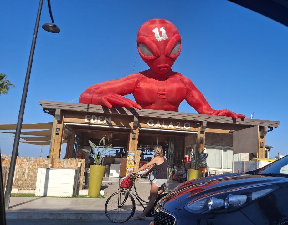 Oggi l’ho visto ancora: un alieno rosso, immobile, gomiti sul tetto, lo sguardo che sembra attraversare le persone. Non fa nulla. Non è ostile. Non è amico. Semplicemente guarda.