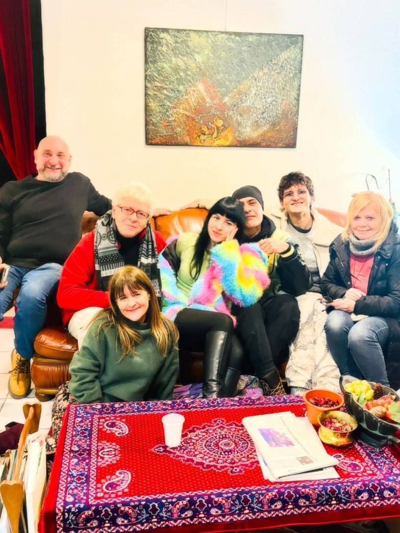 E via via che scorrono scambi, parole, sguardi, diventiamo complici e anche il signore assorto, Nino, che sembrava altrove, si unisce al gruppo, allietandoci con racconti, sorrisi e poesie pescate a caso da uno dei suoi quadernini. Siamo immersi nel viaggio e stiamo navigando su acque profonde e ora dondolanti dove vorrei restare ancora e ancora. Ora i passeggeri hanno nome, storia, volto, e chissà in quale canzone finiranno… ogni vibrazione, ogni parola, ogni respiro è un’onda che ci porta più vicini, dentro e fuori di noi.