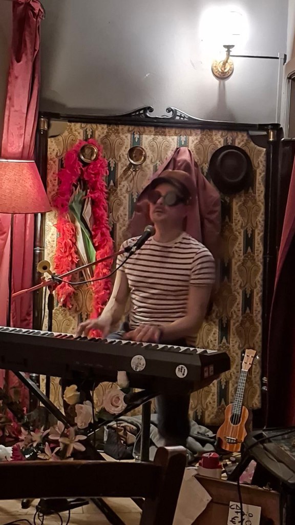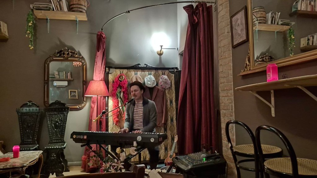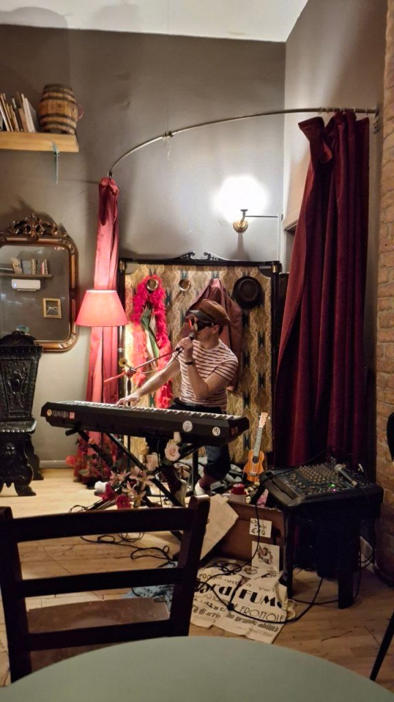 Canta, suona, parla. Non si ferma mai. E non per esibizione, ma per un bisogno profondo di esserci, di cantare davvero. Forse l’energia che sprigiona nasce proprio da questo: la musica non è la sua professione principale, eppure sul palco è un professionista generoso, che non trattiene nulla, come se ogni canzone fosse un’occasione rara da vivere fino in fondo. Il suo stile è subito riconoscibile, perché è suo. Nei testi, nell’interpretazione, nel modo in cui riesce a tenerti lì anche solo con un pianoforte. Passa con naturalezza da un brano su una cimice a una canzone dedicata alla prima figlia, e in questo salto c’è tutta la sua libertà: profondità e leggerezza che convivono. Non c’è nulla di calcolato, indeciso sui brani da proporre, ma c’è preparazione e soprattutto spontaneità, una verità che si sente. Ogni canzone apre un’emozione diversa, perché ogni canzone è diversa. E forse è per questo che si ascolta con il sorriso, con la sorpresa, con quella sensazione rara di stare entrando in un mondo che non avevi mai incontrato prima.