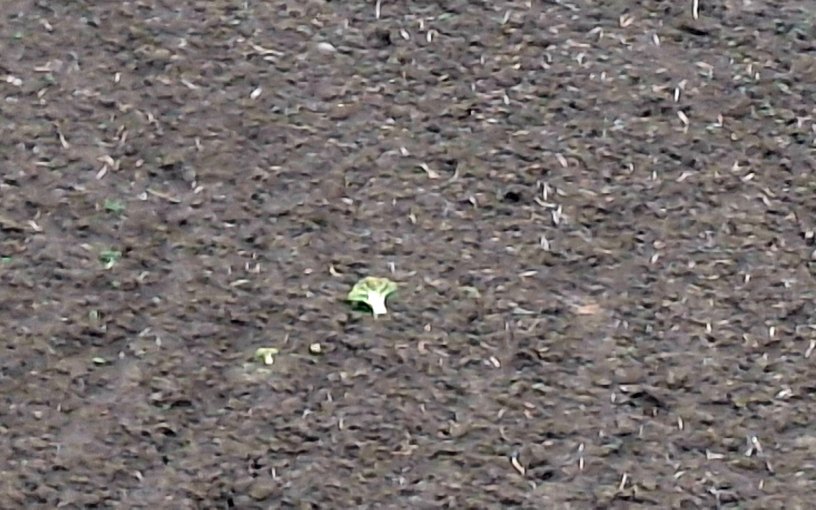 Su un campo di terra marrone giace un broccolo verde brillante.